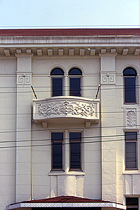 まず、ピラスター(:Pilaster・・飾り柱・半埋め柱)の使い方が、いかにも飾りではなく構造体っぽく壁面より出しているところから東京中央郵便局や大阪中央郵便局のように現代建築への先駆と考えられる。そしてなによりも面白いのが、柱頭部分の装飾。このような模様は歴史上ありません。これぞまさしくデフォルメよ。(仏・・Déformer/英・・Deformation・・素材や対象を作者の主観によってゆがめたり誇張したりする手法) ごいっちゃんもいろいろ考えたんだろうなぁ・・「これからの建築はコレだ!」みたいな。この建物を見学するときはデフォルメ柱頭を見ることをお忘れなく。 |